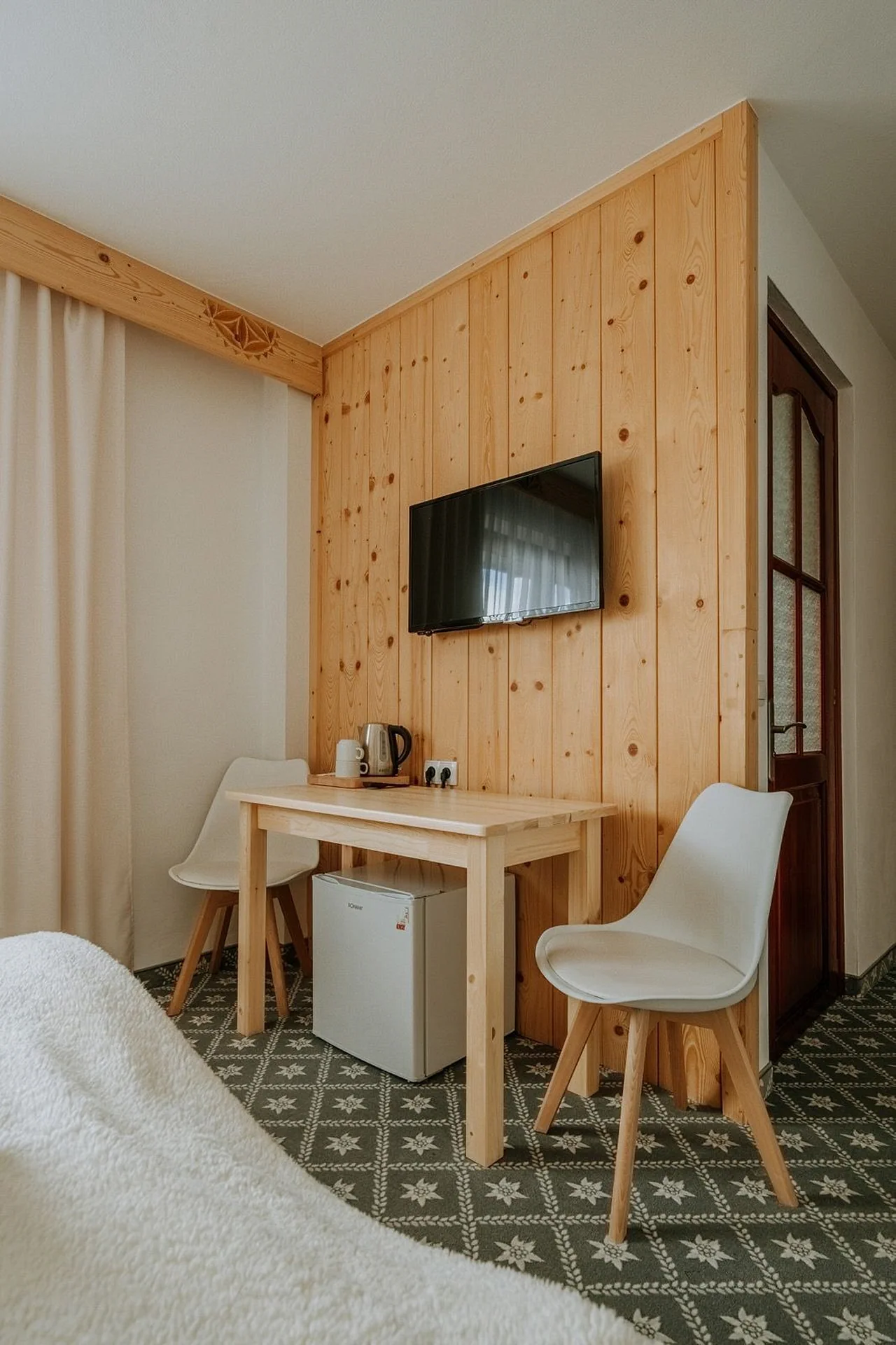 Wyobraź sobie wieczór po całym dniu wędrówki. Wchodzisz do pokoju, gdzie ciepło drewna otula Cię od pierwszej chwili. Wygodne łóżko, widok na Tatry i wszystko, czego potrzebujesz – telewizor, czajnik, stół z krzesłami oraz prywatna łazienka. Rozgość się i odpocznij.