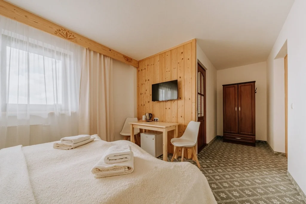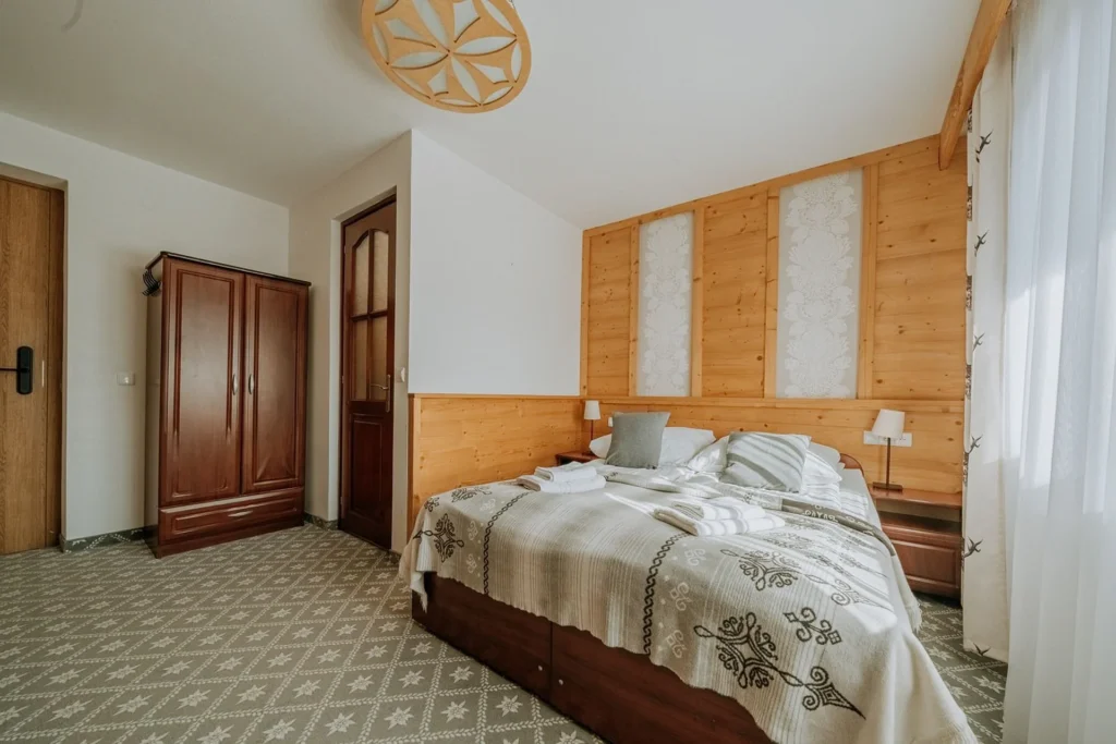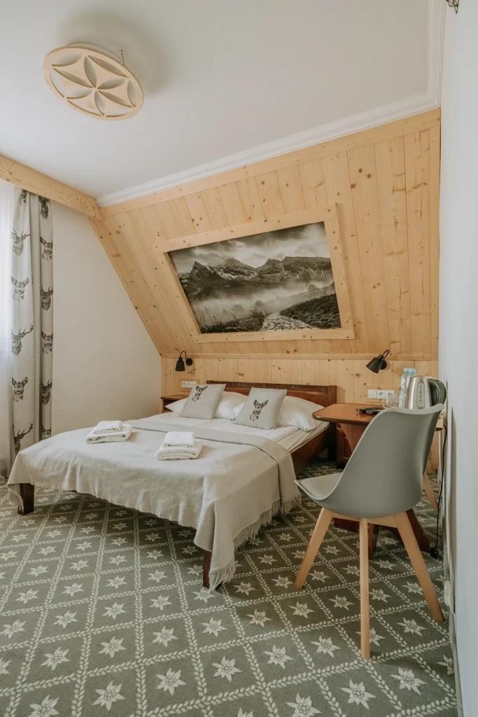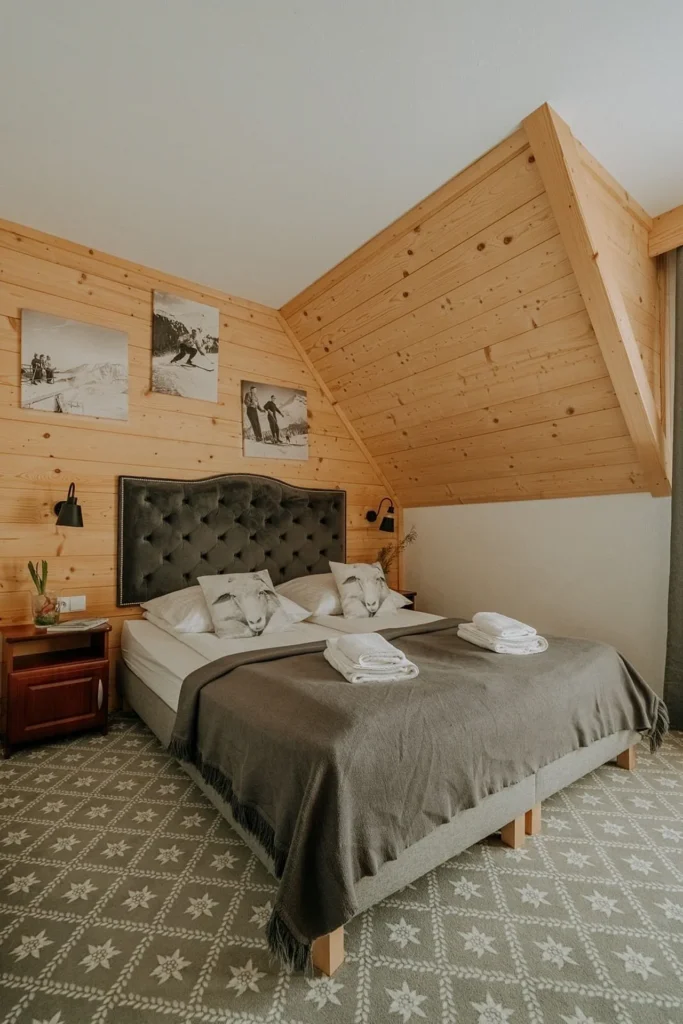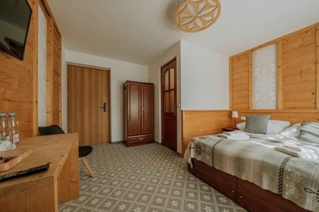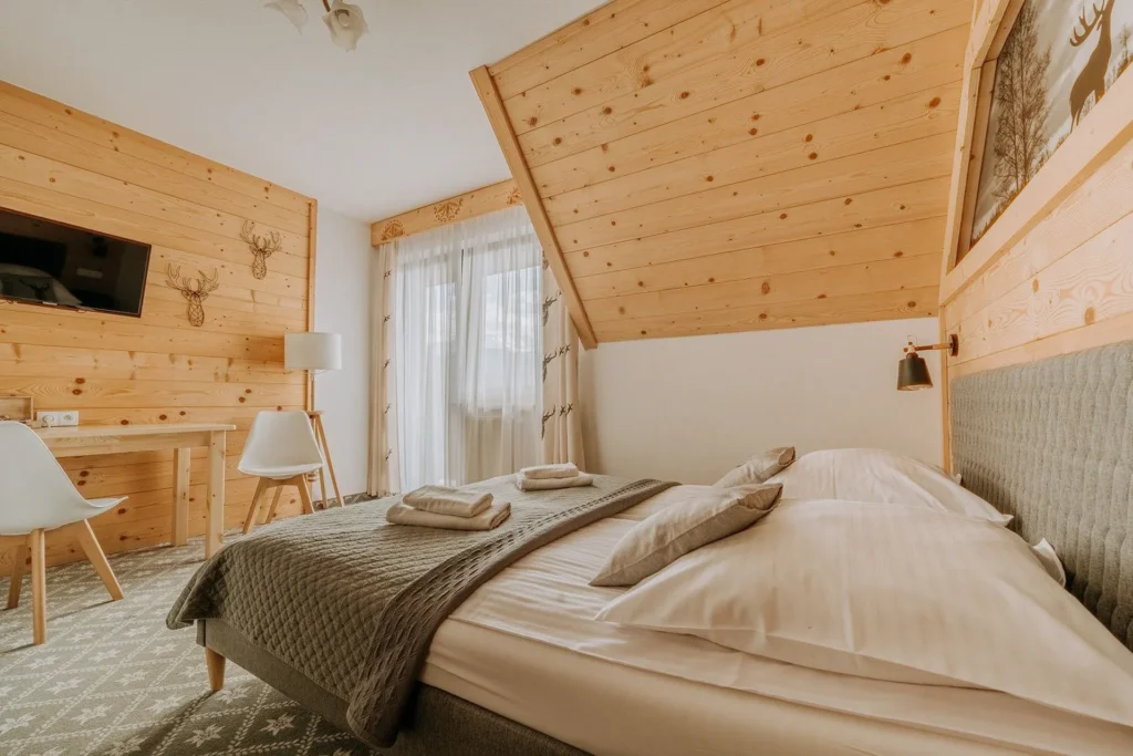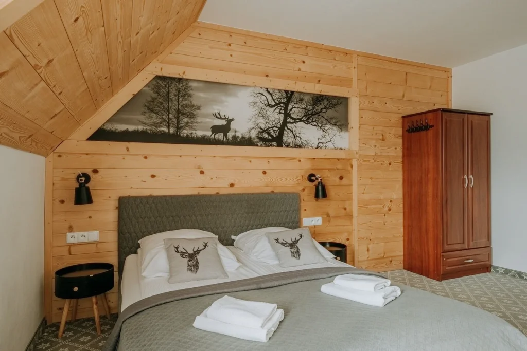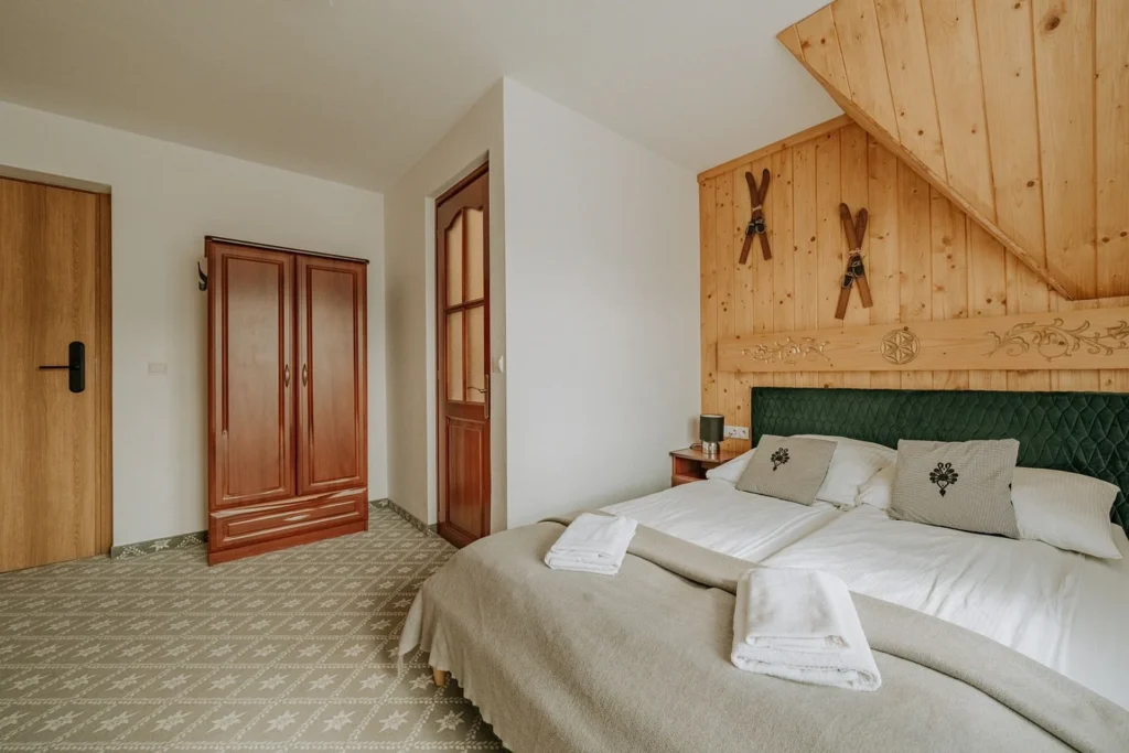 Przestronny pokój 2-osobowy, idealny na wyjazd dla par. Ciepło drewna i stylowe dodatki pozwolą Ci w pełni wypocząć. Znajdziesz w nim: wygodne łóżka, TV, Wi-Fi, czajnik oraz prywatną łazienkę z prysznicem, ręcznikami, zestawem kosmetyków i suszarką.