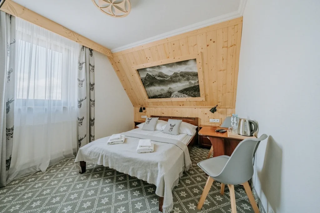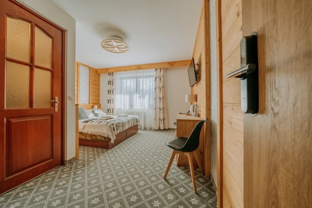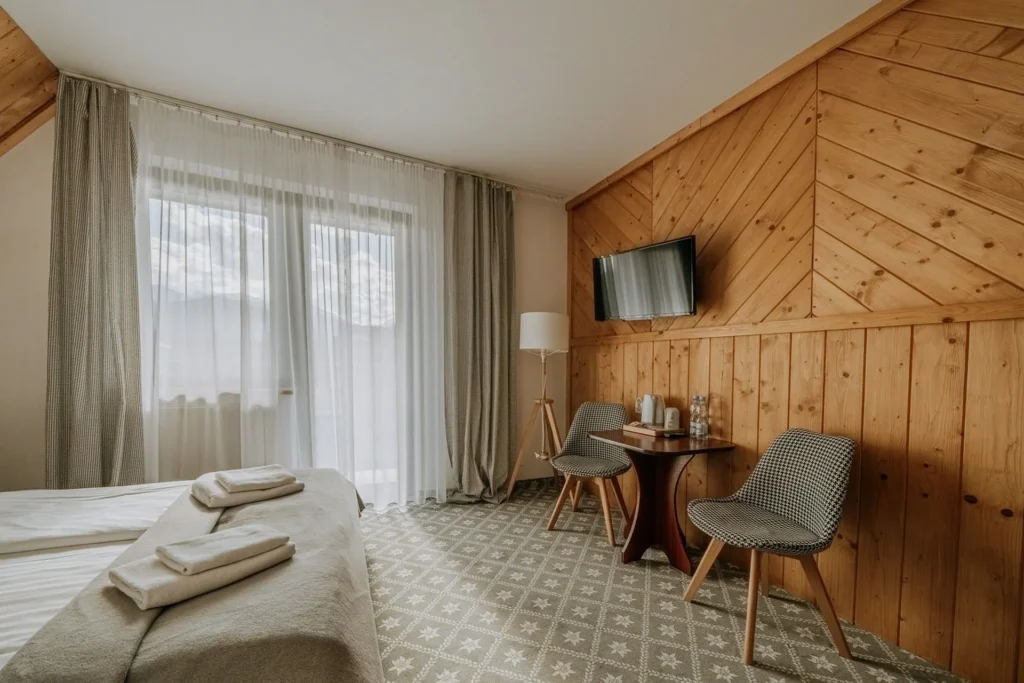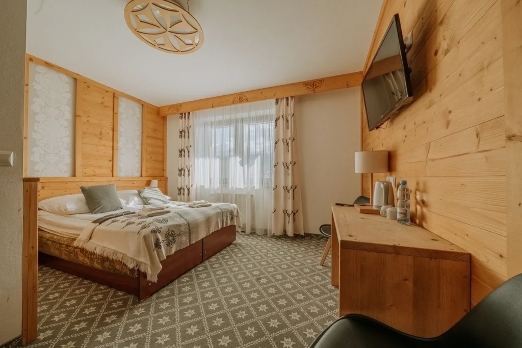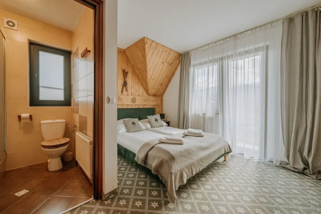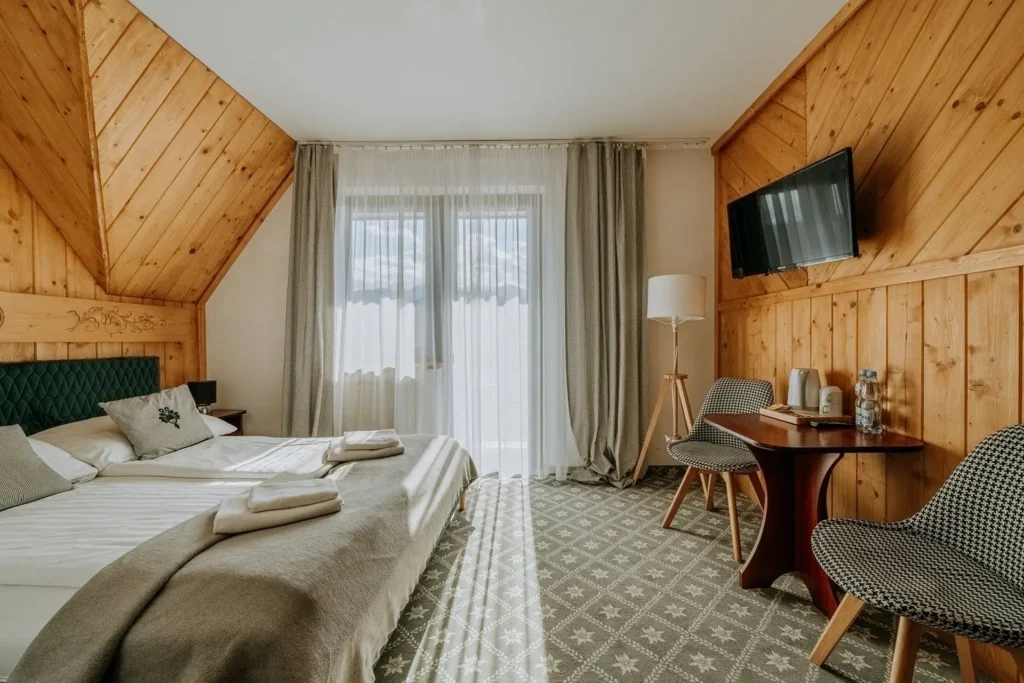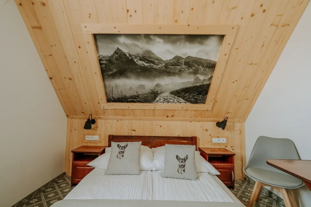 Przestronny pokój 2-osobowy, idealny na wyjazd dla par. Ciepło drewna i stylowe dodatki pozwolą Ci w pełni wypocząć. Znajdziesz w nim: wygodne łóżka, TV, Wi-Fi, czajnik oraz prywatną łazienkę z prysznicem, ręcznikami, zestawem kosmetyków i suszarką.