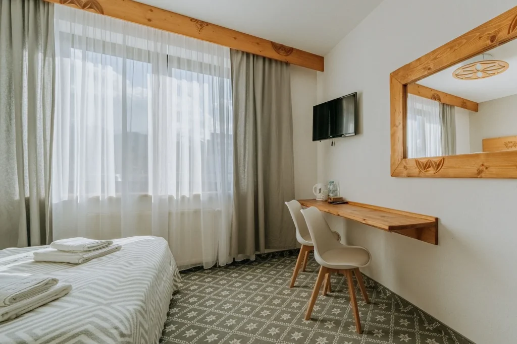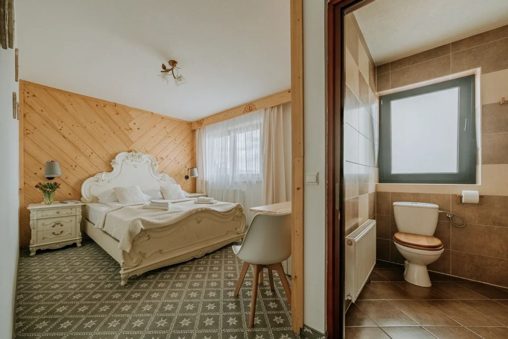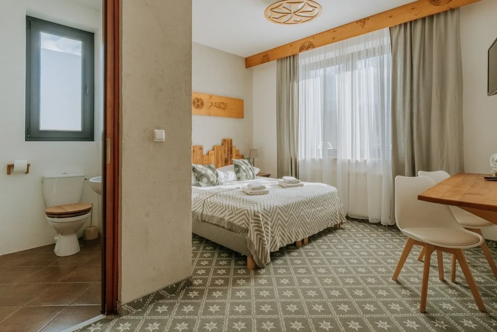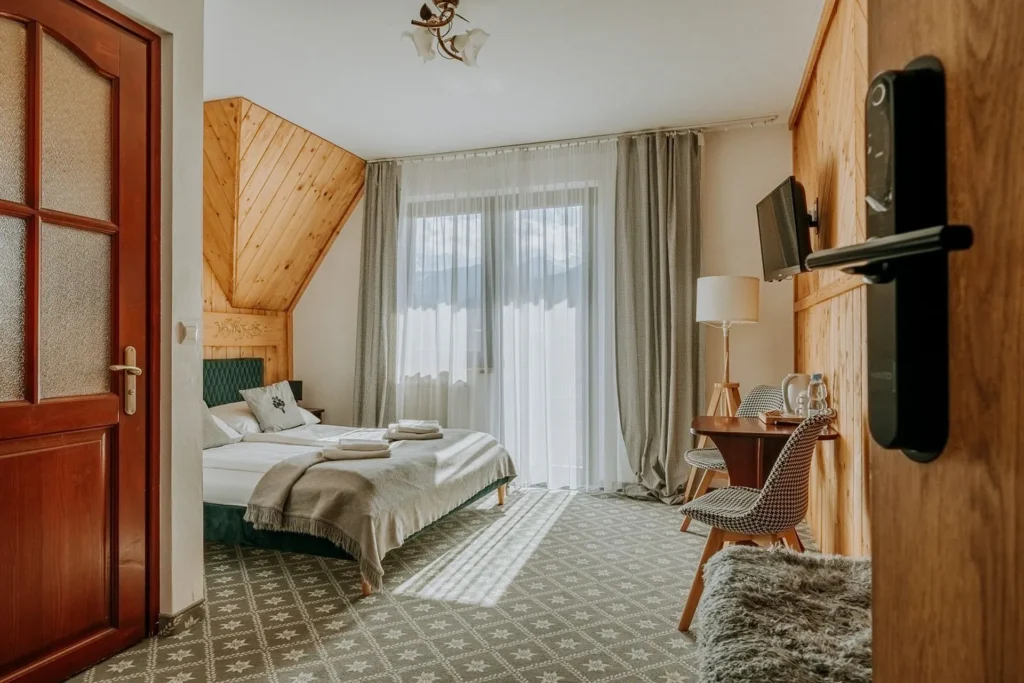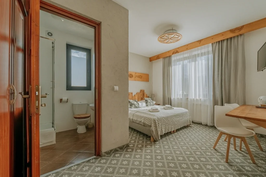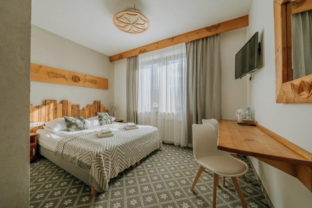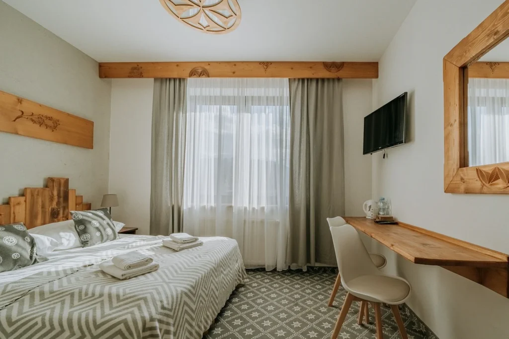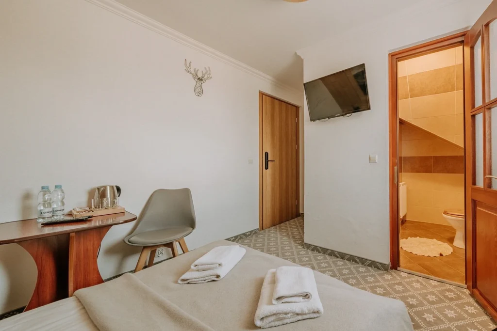 Przestronny pokój 2-osobowy, idealny na wyjazd dla par. Ciepło drewna i stylowe dodatki pozwolą Ci w pełni wypocząć. Znajdziesz w nim: wygodne łóżka, TV, Wi-Fi, czajnik oraz prywatną łazienkę z prysznicem, ręcznikami, zestawem kosmetyków i suszarką.