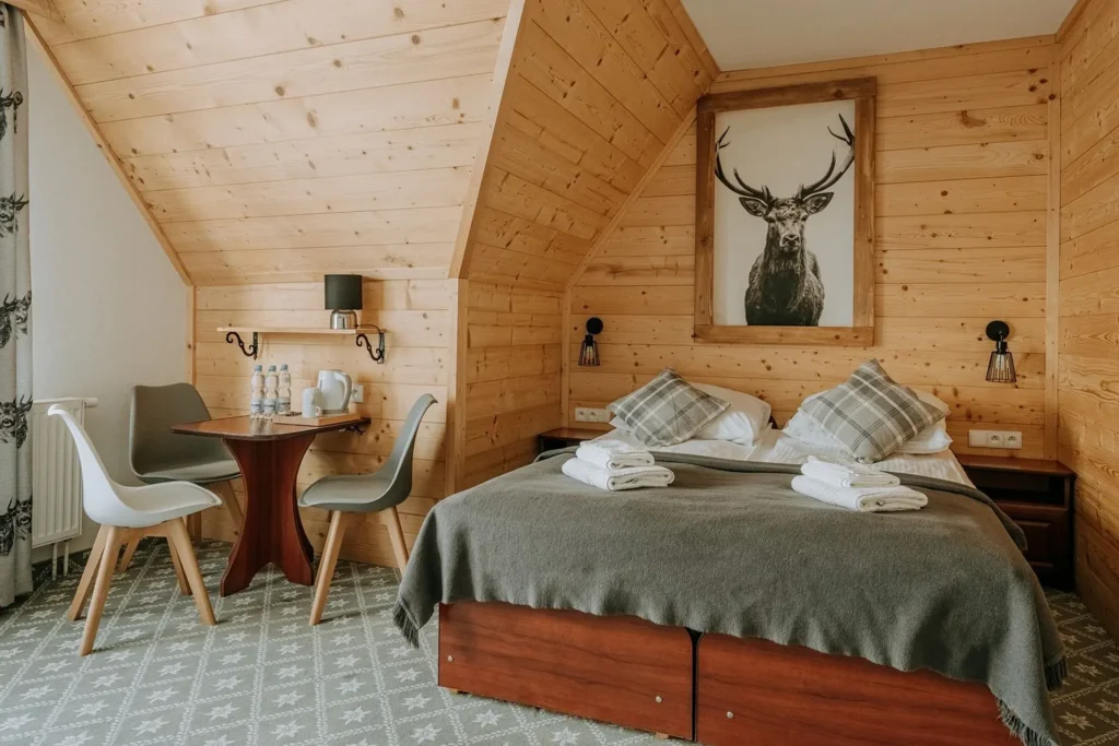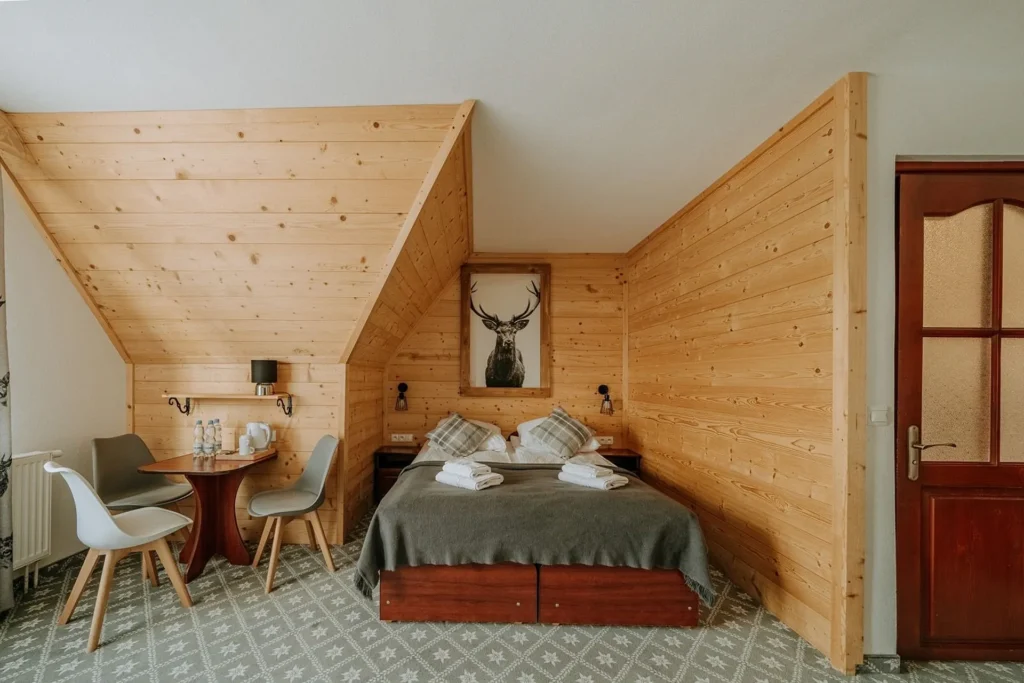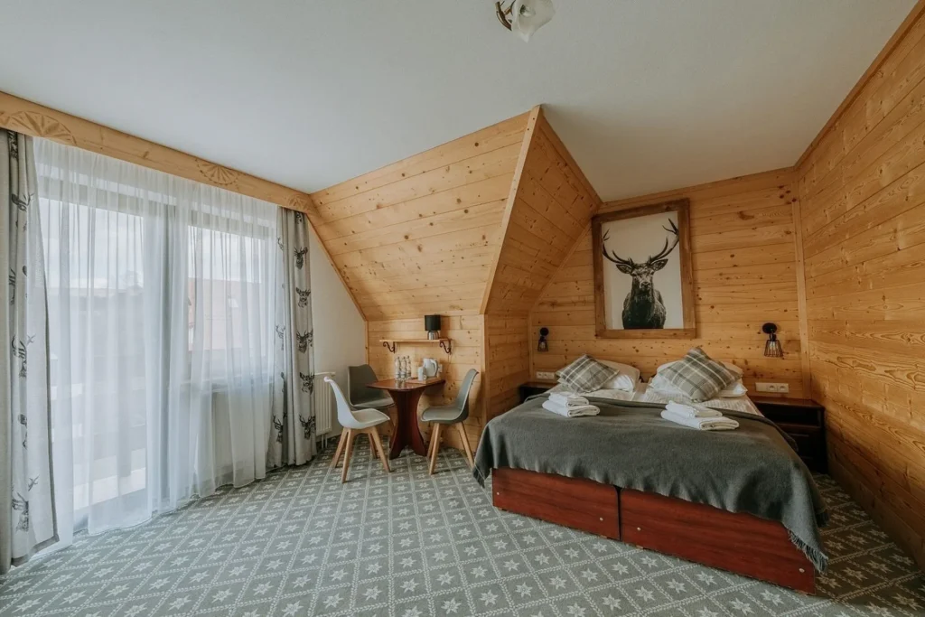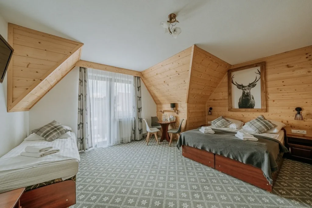Przestronny pokój 3-osobowy, z prywatnym balkonem i widokiem na Tatry. Ciepło drewna i stylowe dodatki pozwolą Ci w pełni wypocząć. Znajdziesz w nim: wygodne łóżka, TV, Wi-Fi, czajnik oraz prywatną łazienkę z prysznicem, ręcznikami, zestawem kosmetyków i suszarką.