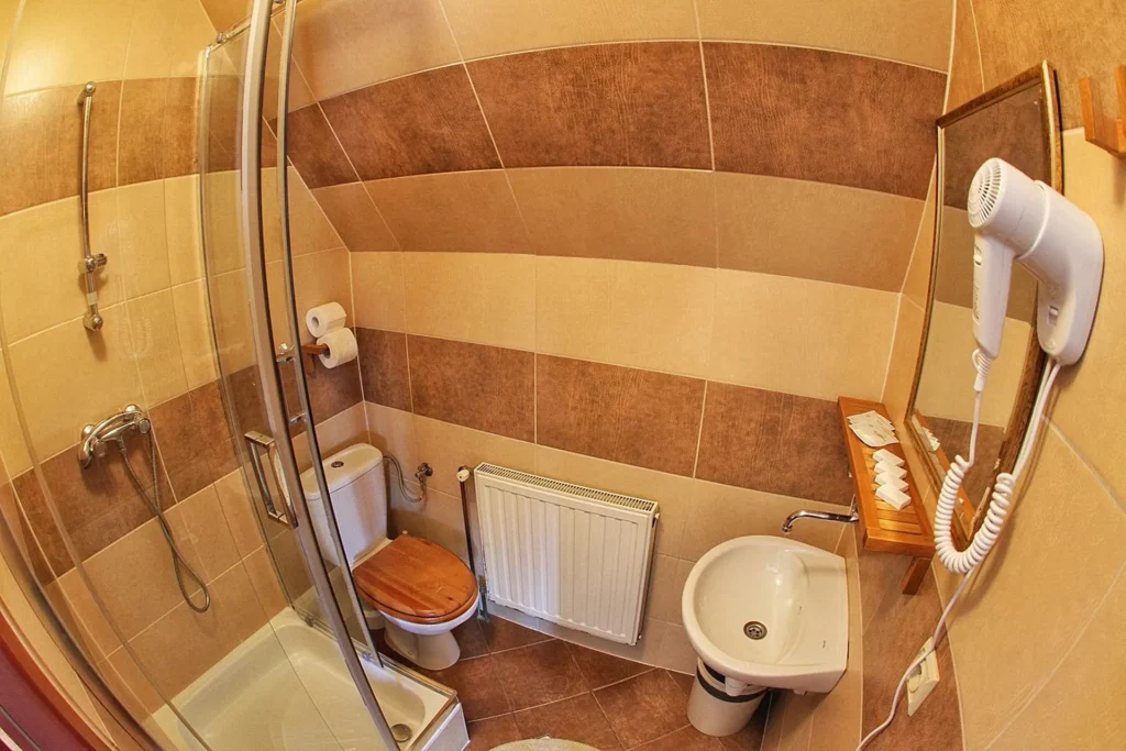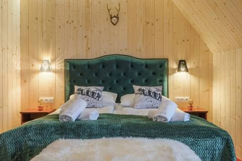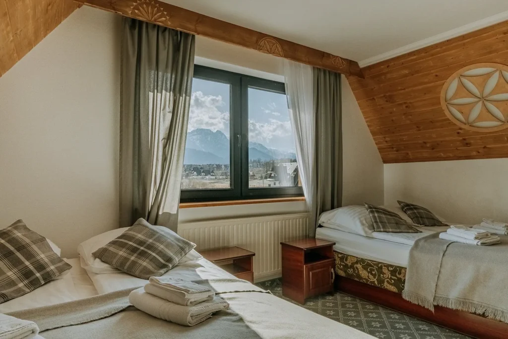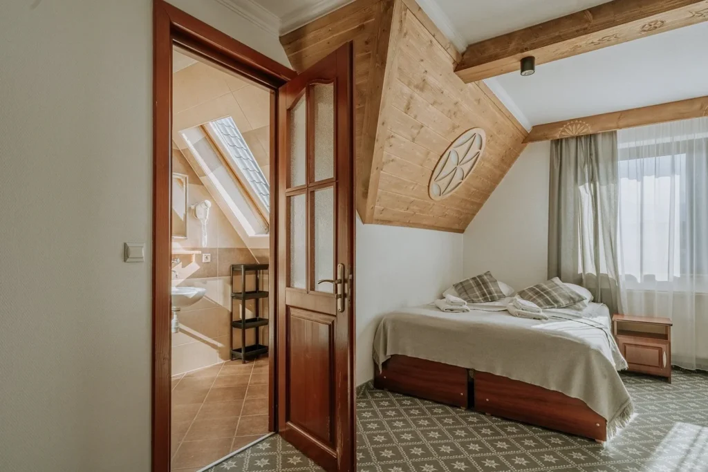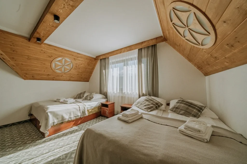 Przestronny pokój 4-osobowy, idealny dla całej rodziny lub grupy przyjaciół. Ciepło drewna i stylowe dodatki pozwolą Ci w pełni wypocząć. Znajdziesz w nim: wygodne łóżka, TV, Wi-Fi, czajnik oraz prywatną łazienkę z prysznicem, ręcznikami, zestawem kosmetyków i suszarką.